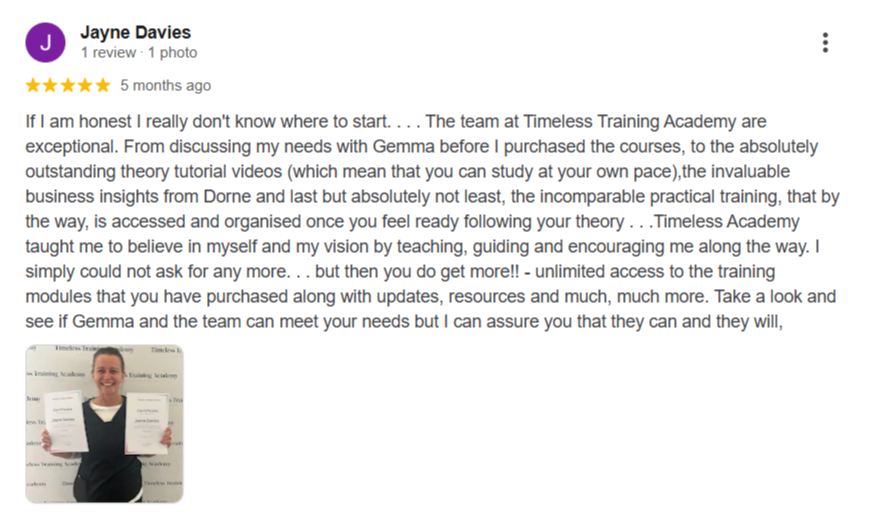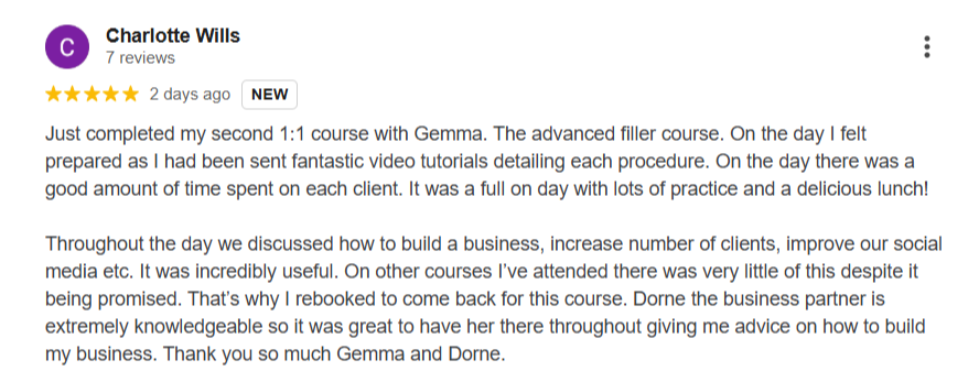 Gemma is an amazing teacher. Her passion for aesthetics shines through, and she was patient with me from the start. Her podcasts complement the training, emphasising her caring approach. Even after qualifying, Gemma remains available on WhatsApp for any questions.